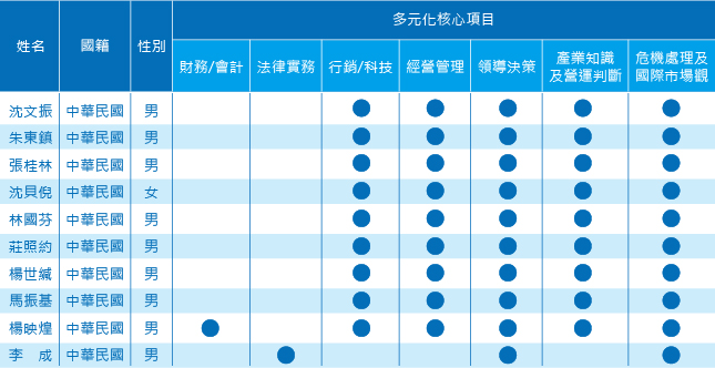 ● 本公司現任董事會由10位董事組成,包含4位獨立董事及6位非獨立董事,現有董事皆為產學界賢達,擁有經營企業管理實務或擔任政府機關管理職務經驗,除均具備領導決策、危機處理及國際市場觀外,其中4席獨立董事中,楊世緘獨立董事曾任總統府國策顧問、經濟部政務次長、經濟部工業局局長等;馬振基獨立董事為國科會及國立清華大學化工研究所客座專家、國立清華大學化工系特聘教授/特聘講座教授;楊映煌獨立董事曾任台塑海運(股)公司董事、台塑海運(股)公司總經理、台塑集團總管理處資深副總;李成獨立董事現任東海大學法律系副教授,畢業於美國杜蘭大學法律學博士,專長領域為貿易法、國際經貿法、公司法及智慧財產權法等等,分別具有財務會計、產業知識、營運判斷及法律實務等專業。另6席非獨立董事中,沈文振董事長、朱東鎮董事、張桂林董事、沈貝倪董事、林國芬董事及莊照約董事等均有擔任公司之董事長或總經理等重要管理職務經驗,公司產業含括航空、傳統製造等,具備行銷、經營管理、產業知識、營運判斷等專業能力及危機處理及國際市場觀等專業。
